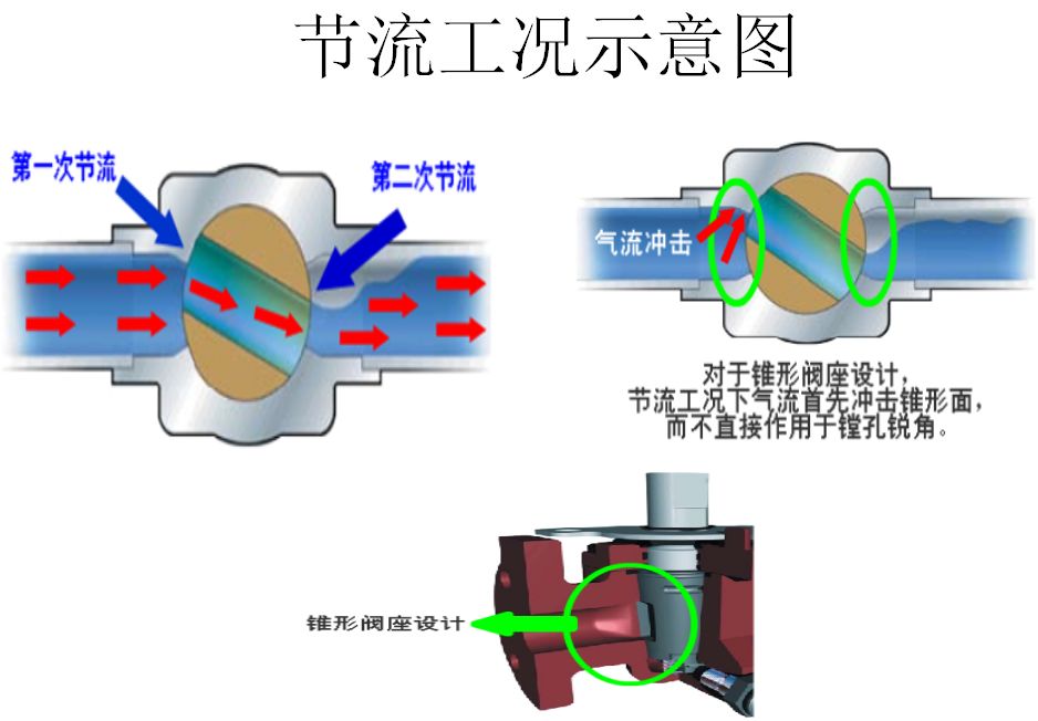 對(duì)于錐形閥座設(shè)計(jì)的旋塞閥,節(jié)流工況下氣體流入閥芯時(shí),氣流首先沖擊它前面錐形閥座的錐面,通過錐面的導(dǎo)向作用該表方向后進(jìn)入閥芯,而不是直接沖擊閥芯鏜孔的銳角,加之閥芯可以根據(jù)節(jié)流工況設(shè)計(jì)多樣的流動(dòng)面、形狀和功能所以旋塞閥可以用于節(jié)流工況。
